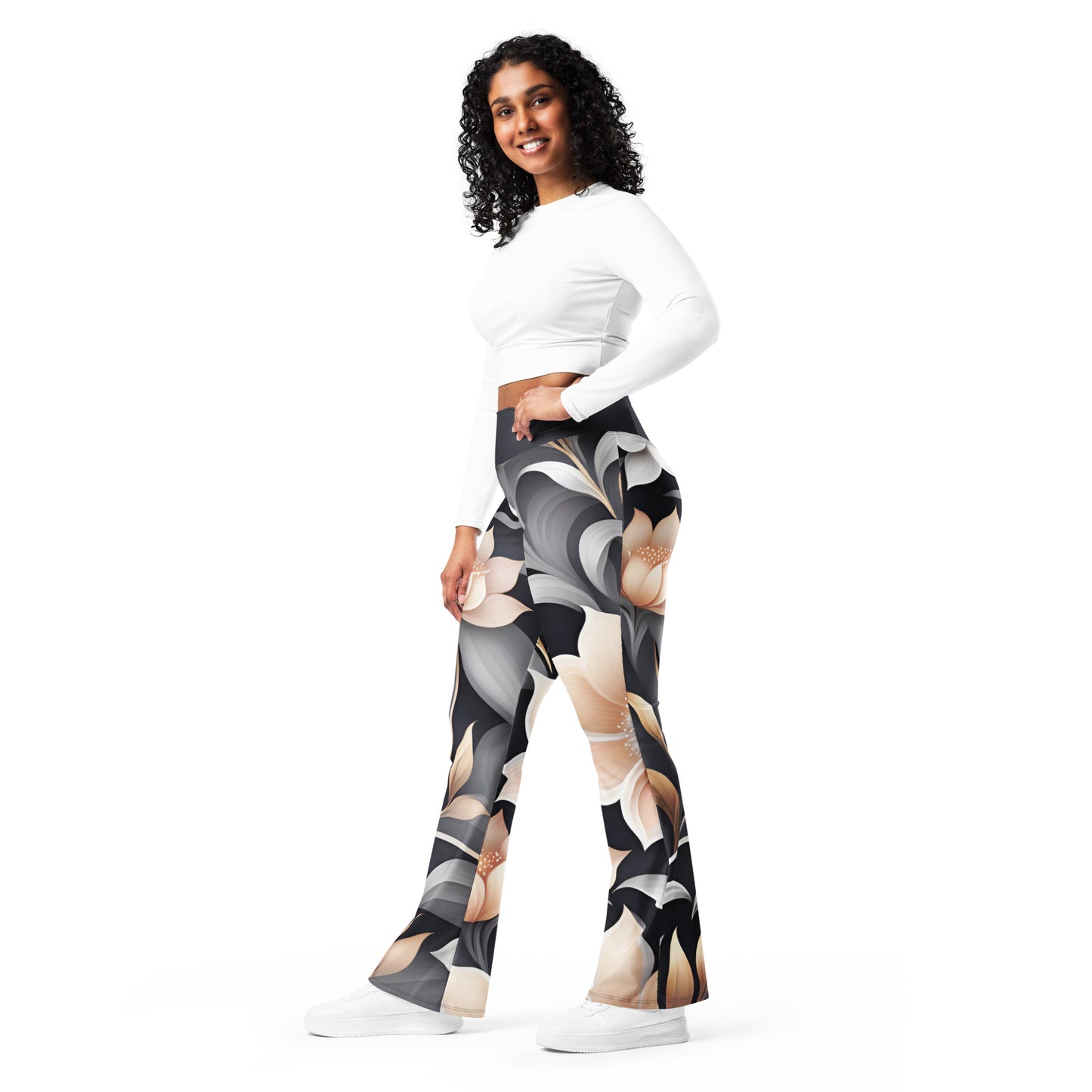 Designed to enhance your figure, these trendy leggings feature a high waist and a butt-lifting cut. The flared leg bottoms add a touch of style and make the leggings comfortable. Wear them on a walk, to the gym, or style them up with a bomber jacket or hoodie.